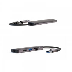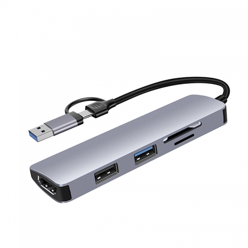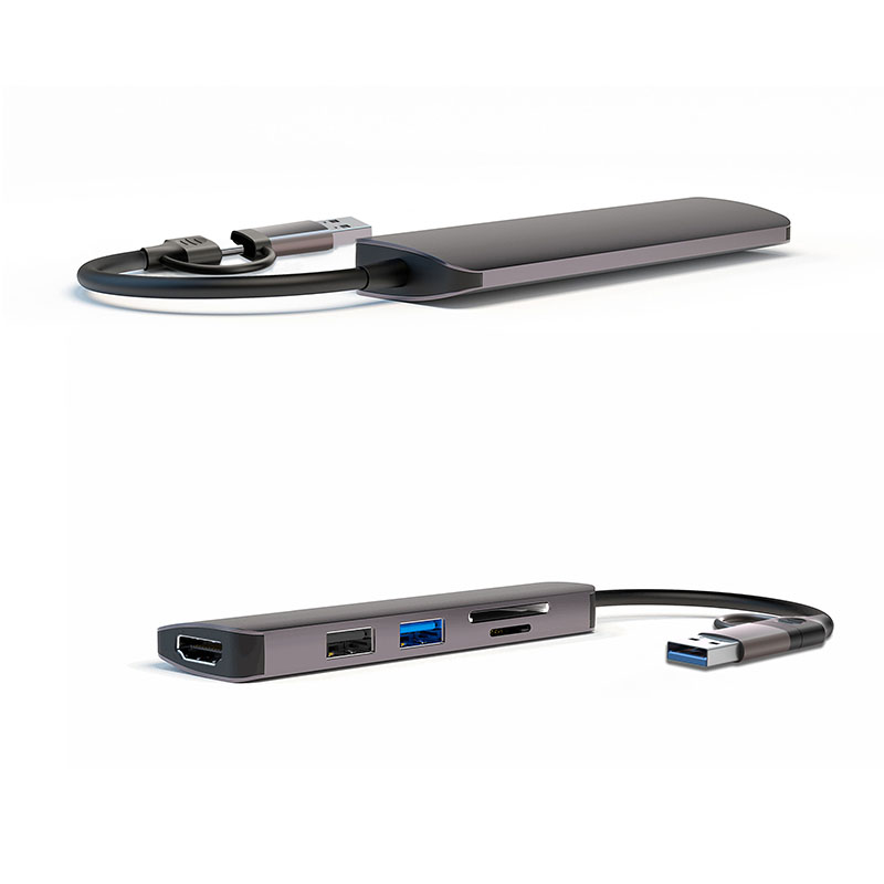 5in1 USB A/USB C Dual input to: 1*HDMI 1080P; 1*USB3.0 ; 1*USB2.0 ; 1*TF, 2.0 card reader; 1*SD, 2.0 card reader Material: Aluminum ; Weight:47g, Cable length: 15cm Size : 104x31x11mm
